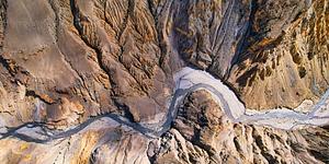 From above, the braided waterways of Upper Mustang carve through the sculpted canyon walls like arteries of life. This aerial perspective reveals the raw geological forces that have shaped this otherworldly landscape over millennia, creating a mesmerizing pattern of erosion that appears almost painted across the earth.
