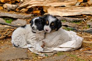 Two Puppies Cuddling In The Dirt